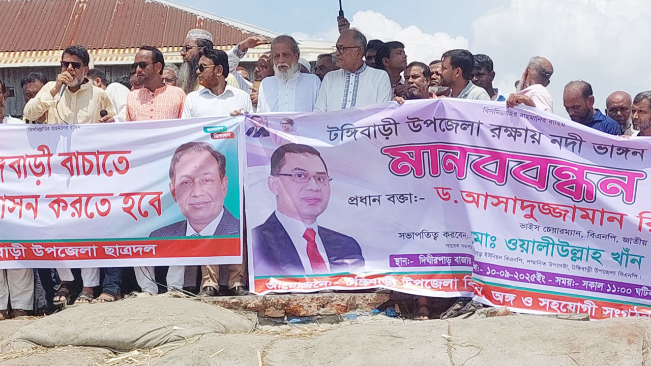 বুধবার (১০ সেপ্টেম্বর) দুপুরে মুন্সীগঞ্জের টংগিবাড়ী উপজেলার দিঘিরপাড় বাজারে স্থানীয় বিএনপি আয়োজিত স্থায়ী বাঁধ নির্মাণের দাবিতে মানববন্ধন কর্মসূচিতে প্রধান বক্তার বক্তব্যে তিনি এসব কথা বলেন।