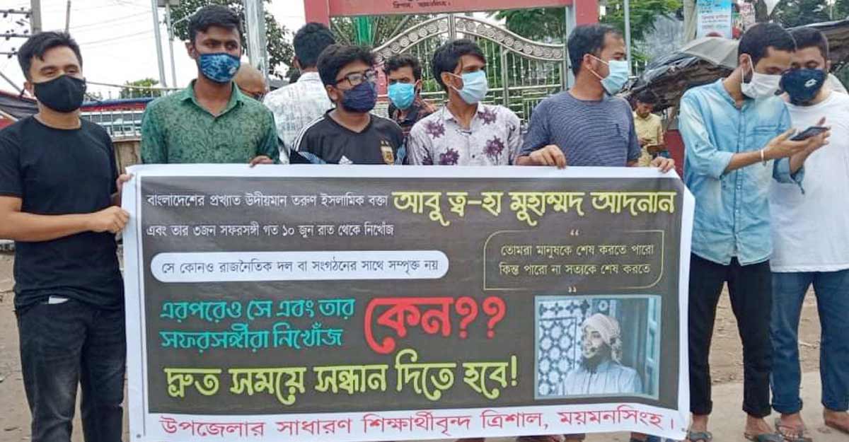 ছয় দিন ধরে নিখোঁজ থাকা তরুণ ইসলামি বক্তা আবু ত্ব-হা মুহাম্মদ আদনানের সন্ধান চেয়ে ময়মনসিংহের ত্রিশালে মানববন্ধন অনুষ্ঠিত হয়েছে। বুধবার (১৬ জুন) বিকেলে উপজেলার পৌর এলাকার সরকারি নজরুল কলেজের সামনে এ মানববন্ধনের আয়োজন করা হয়।