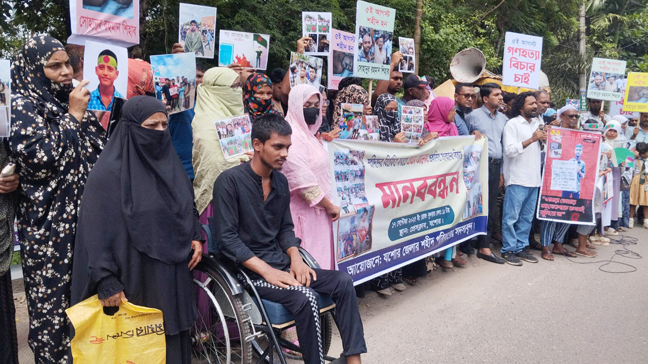 জুলাই অভ্যুত্থানে যশোরের ‘জাবির ট্র্যাজেডি’-তে নিহত ২৪ জনের শহীদের স্বীকৃতি চেয়ে মানববন্ধন করেছেন নিহতদের পরিবার।