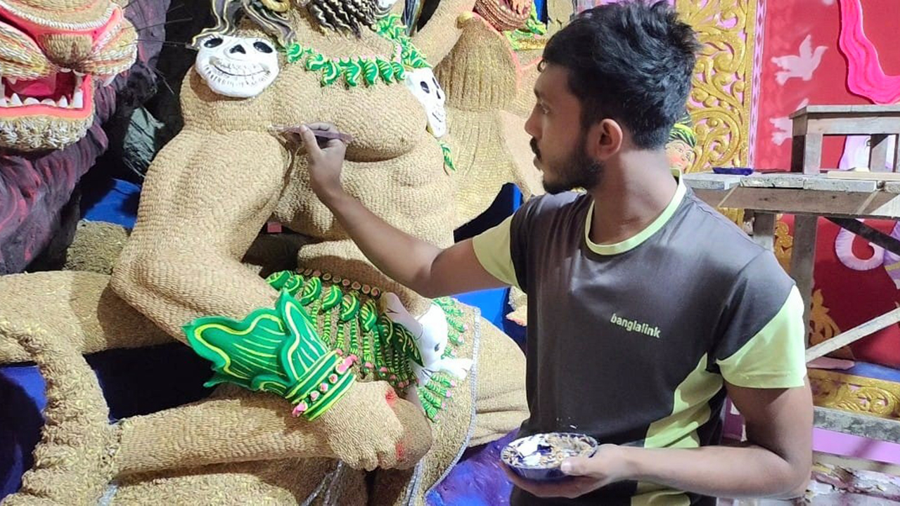 প্রধান প্রতিমা শিল্পী রাজিব সরদার ঢাকা পোস্টকে বলেন, আমরা সব সময় মাটি আর রঙ তুলির আচরে প্রতিমা বানালেও এ বছর বিশেষ আকর্ষণ হিসেবে ধান দিয়ে প্রতিমা বানাচ্ছি। যা এই অঞ্চলে এর আগে কেউ বানায়নি।