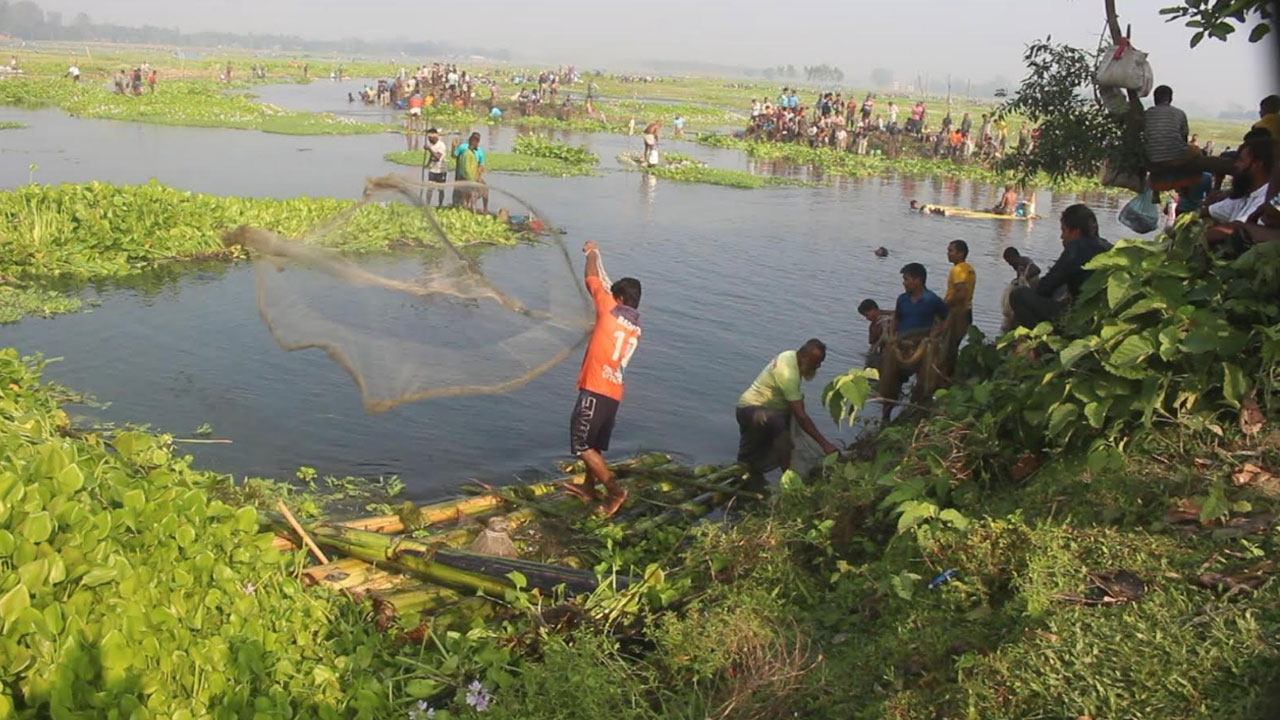 শনিবার (১৮ অক্টোবর) সকাল থেকে বিকেল পর্যন্ত দেখা যায়, জাল, পলো আর মাছ রাখার পাত্র খলই নিয়ে ভোর থেকেই বাঁধ এলাকায় জড়ো হয় হাজারো মানুষ। কেউ ভেলায়, কেউ ছোট নৌকায় করে মাছ ধরছেন। এ যেন মাছ ধরার প্রতিযোগিতা। আর বাঁধে দাঁড়িয়ে তাদের উৎসাহ দিয়ে যাচ্ছেন বন্ধু-বান্ধব ও স্বজনরা। মাছ ধরার জন্য আশপাশের কয়েক গ্রামের ও জেলার বিভিন্ন এলাকা থেকে মানুষ যেন ভেঙে পড়েছে নদীর তীরে। এতে লোকে লোকারণ্য হয় এলাকাটি।