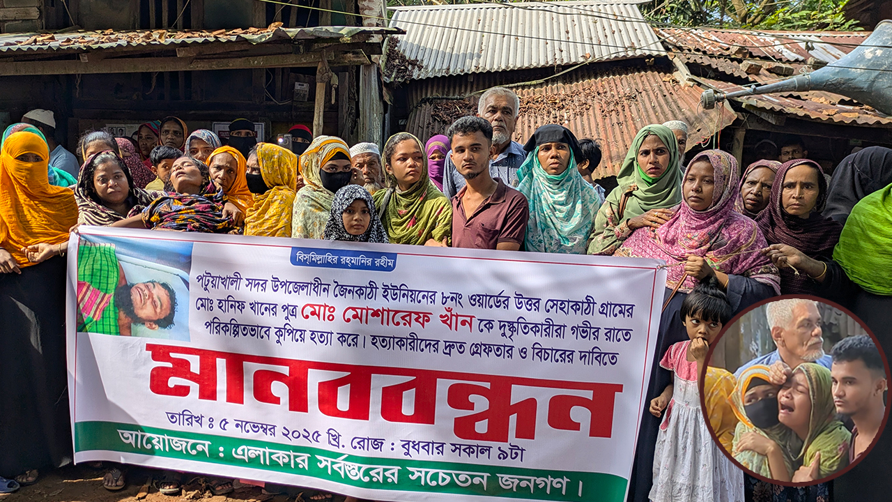পটুয়াখালীর জৈনকাঠী ইউনিয়নে মেয়েকে রক্ষা করতে গিয়ে বাবা মোশারেফ খান খুন হওয়ার ঘটনায় জড়িতদের দ্রুত গ্রেপ্তার ও বিচারের দাবিতে মানববন্ধন করেছেন এলাকাবাসী।
