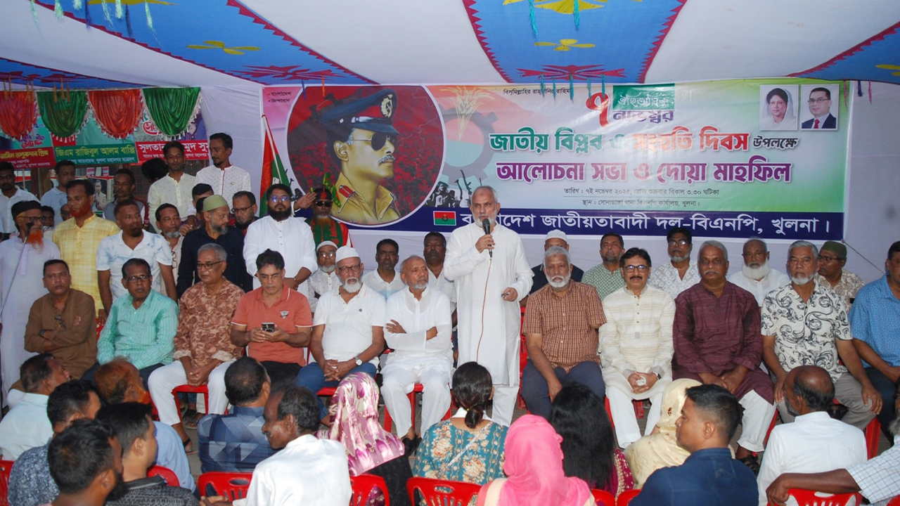 শুক্রবার (৭ নভেম্বর) বিকেল সাড়ে ৩টায় নগরীর কেডিএ এভিনিউস্থ তেঁতুলতলা মোড়ে সোনাডাঙ্গা থানা বিএনপির কার্যালয়ে ঐতিহাসিক ৭ নভেম্বর জাতীয় বিপ্লব ও সংহতি দিবস উপলক্ষে খুলনা বিএনপি আয়োজিত আলোচনা সভা ও দোয়া মাহফিলে প্রধান অতিথির বক্তব্যে তিনি এসব কথা বলেন।