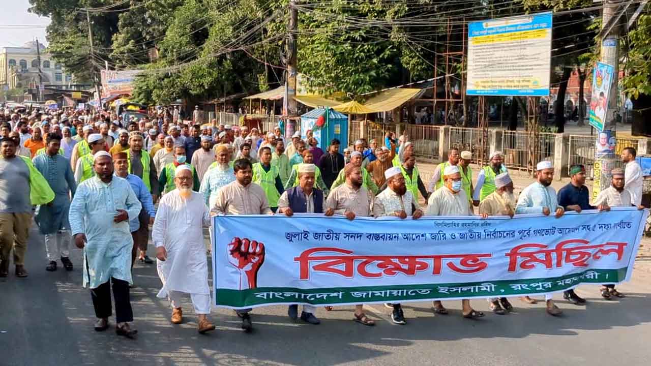 জুলাই জাতীয় সনদ বাস্তবায়ন আদেশ জারি, জাতীয় নির্বাচনের আগে গণভোট আয়োজনসহ পাঁচ দফা দাবিতে রংপুরে বিক্ষোভ মিছিল ও সমাবেশ বাংলাদেশ জামায়াতে ইসলামী।