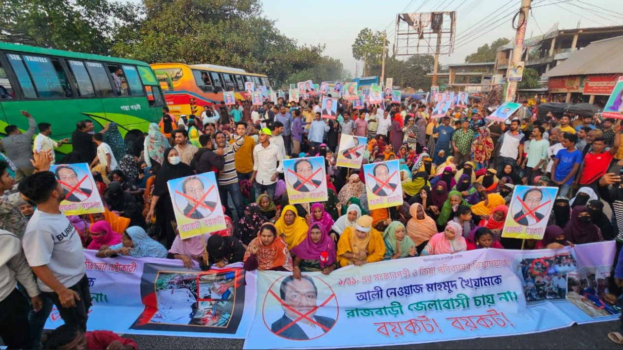 রোববার (১৬ নভেম্বর) বিকেল সাড়ে ৪টার দিকে সদর উপজেলার গোয়ালন্দ মোড়ে আলী নেওয়াজ মাহমুদ খৈয়মের ছবি সংযুক্ত বয়কট লেখা ব্যানার ও প্ল্যাকার্ড হাতে নিয়ে সড়ক অবরোধ করেন সহস্রাধিক নেতাকর্মী।