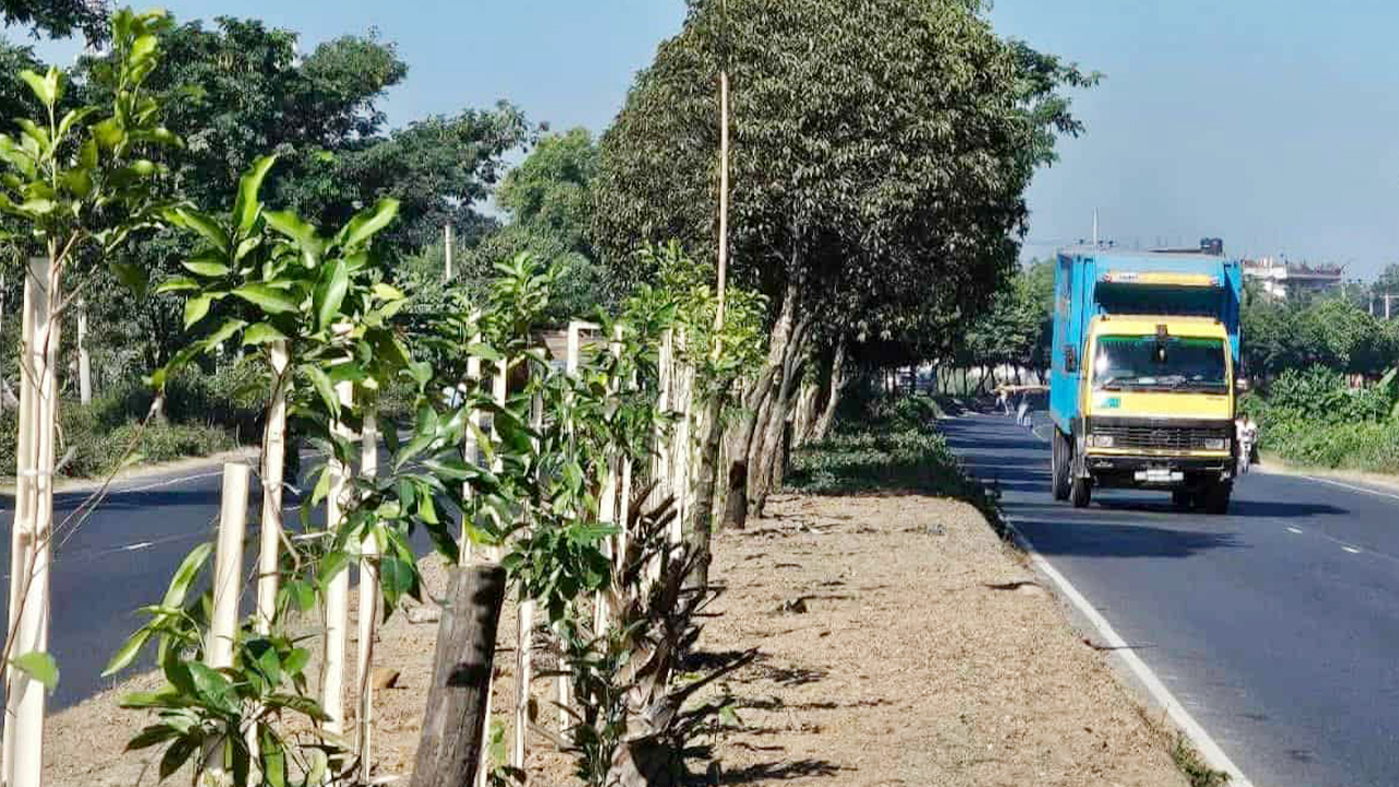 সড়ক বিভাজকের কাটা গাছের জায়গায় বকুল চারা রোপণ