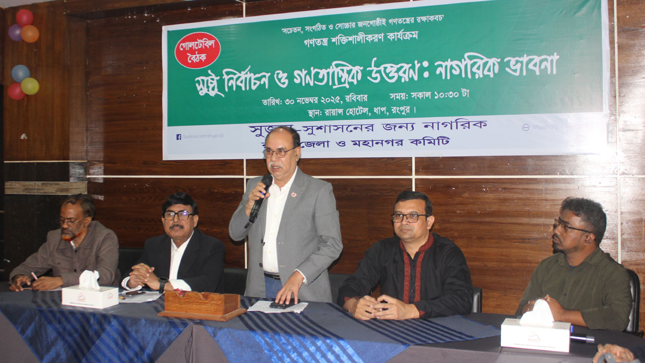 রোববার (৩০ নভেম্বর) দুপুরে রংপুর নগরীর একটি হোটেলের কনফারেন্স রুমে অনুষ্ঠিত ‘সুষ্ঠু নির্বাচন ও গণতান্ত্রিক উত্তরণ: নাগরিক ভাবনা’ শীর্ষক গোল টেবিল বৈঠকে সুশীল ও নাগরিক সমাজের প্রতিনিধিরা এসব কথা বলেন। সুশাসনের জন্য নাগরিক-সুজন রংপুর জেলা ও মহানগর কমিটি আয়োজিত এ বৈঠকে ছাত্র-শিক্ষক, আইনজীবী-সাংবাদিক, সাংস্কৃতিককর্মী, জনপ্রতিনিধিসহ পেশাজীবী সংগঠনের প্রতিনিধিরা অংশ নেন।