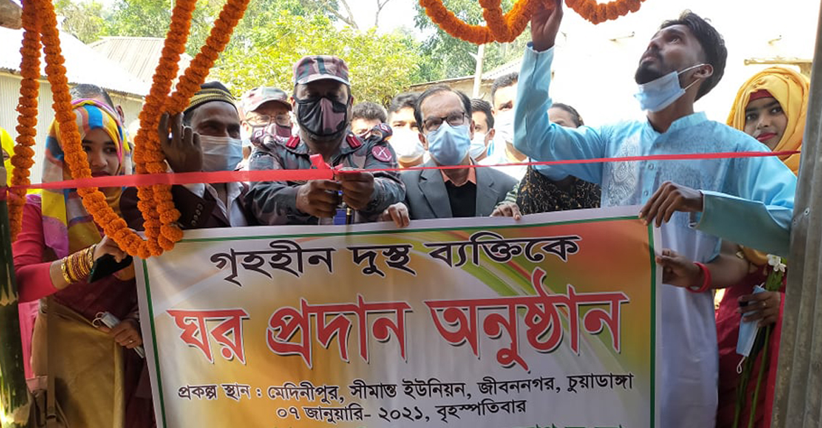 আলতাফ হোসেনকে ঘর উপহার দেওয়ার সময় উপস্থিত ছিলেন শিকড় সমাজ কল্যাণ সংস্থার চুয়াডাঙ্গা জেলা কমিটির সাধারণ সম্পাদক মিঠুন মাহমুদ ও মহেশপুর ৫৮ বিজিবির পরিচালক লে. কর্নেল কামরুল আহসান।