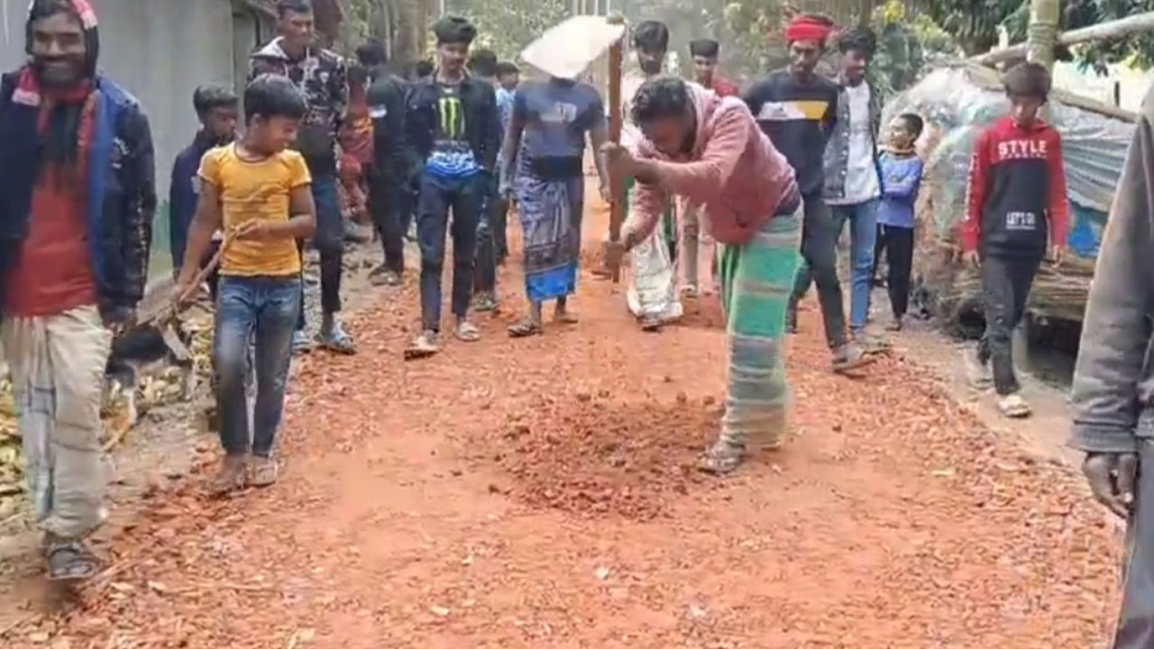 সড়ক নির্মাণে নিম্নমানের সামগ্রী ব্যবহার, কাজ বন্ধ করে দিলো এলাকাবাসী