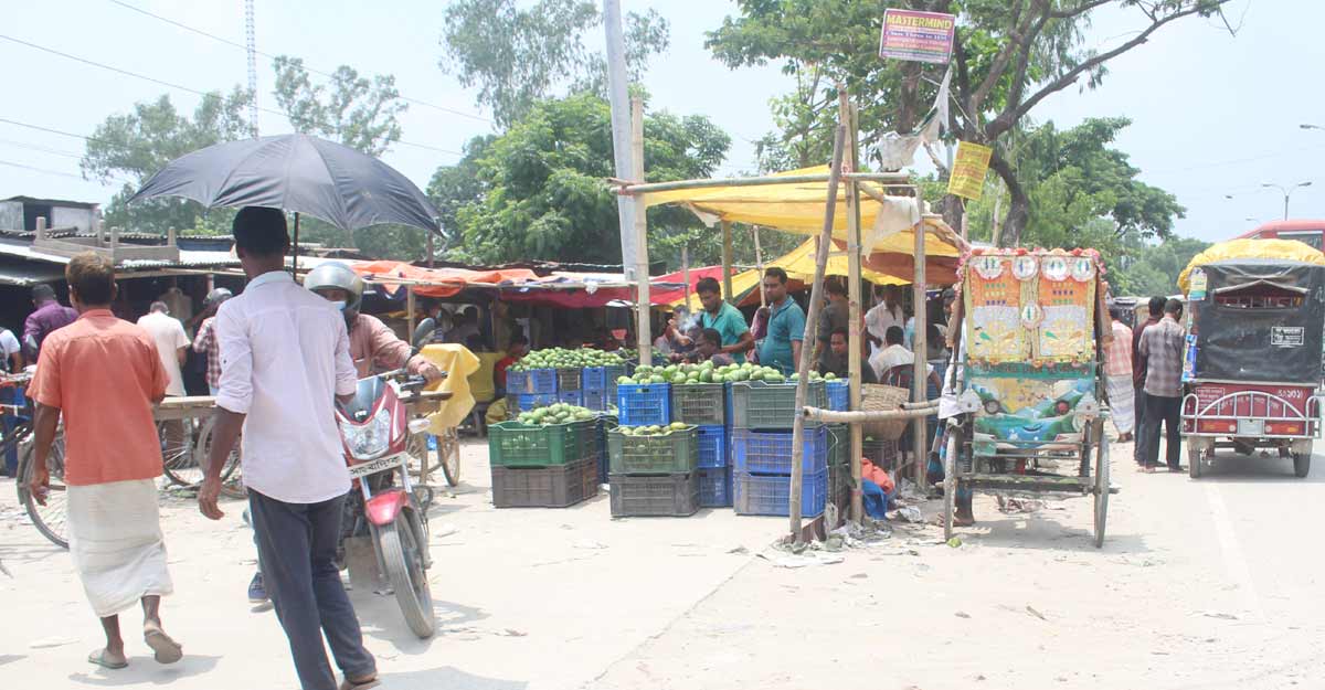 রংপুর নগরের কেন্দ্রীয় বাস টার্মিনালের বাইপাস সড়ক ও ফুটপাতের দুইপাশে অস্থায়ী টিনের চালা তুলে বসানো হয়েছে হাঁড়িভাঙা আমের বাজার। এই ব্যবসা ঘিরে সড়কের ওপরে বিচ্ছিন্নভাবে দোকানপাটও দেওয়া হয়েছে। এতে করে ফুটপাতে হাঁটতে গিয়ে দুর্ভোগে পড়ছেন পথচারীরা।