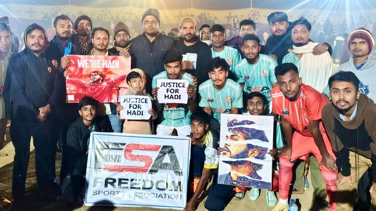 গ্রামে ফুটবল ম্যাচে ‘হাদির হত্যার’ বিচারের দাবিতে প্ল্যাকার্ড প্রদর্শন