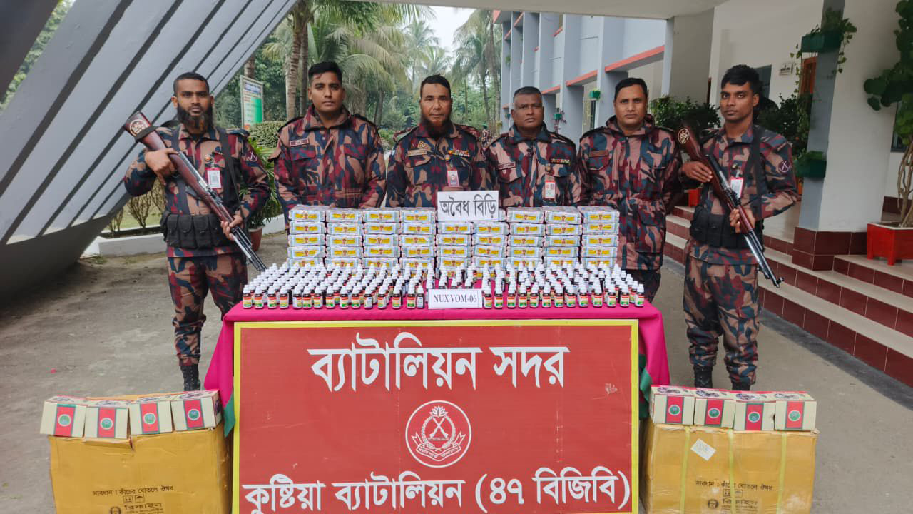 কুষ্টিয়ায় বিশেষ অভিযান চালিয়ে মালিকবিহীন বিপুল পরিমাণ অ্যালকোহল ও অবৈধ নকল বিড়ি উদ্ধার করেছে বর্ডার গার্ড বাংলাদেশ (বিজিবি) ৪৭ ব্যাটালিয়ন।