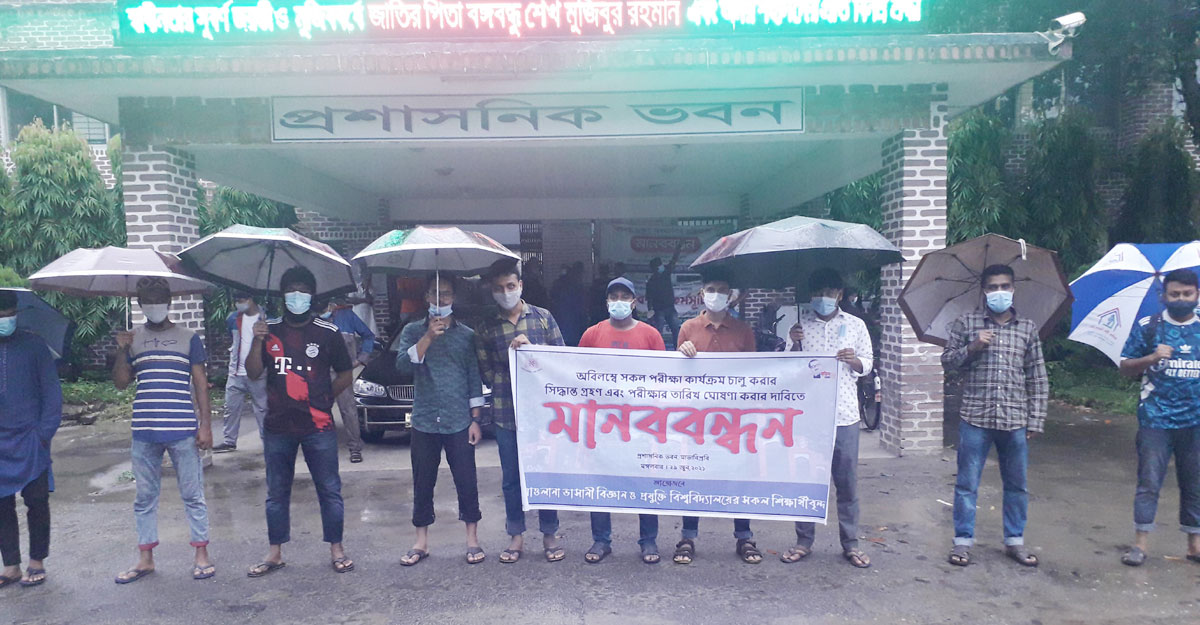 বিশ্ববিদ্যালয়ে সকল পরীক্ষা কার্যক্রম চালুর দাবিতে মাওলানা ভাসানী বিজ্ঞান ও প্রযুক্তি বিশ্ববিদ্যালয়ের শিক্ষার্থীরা প্রশাসনিক ভবনের সামনে মানববন্ধন করেছে