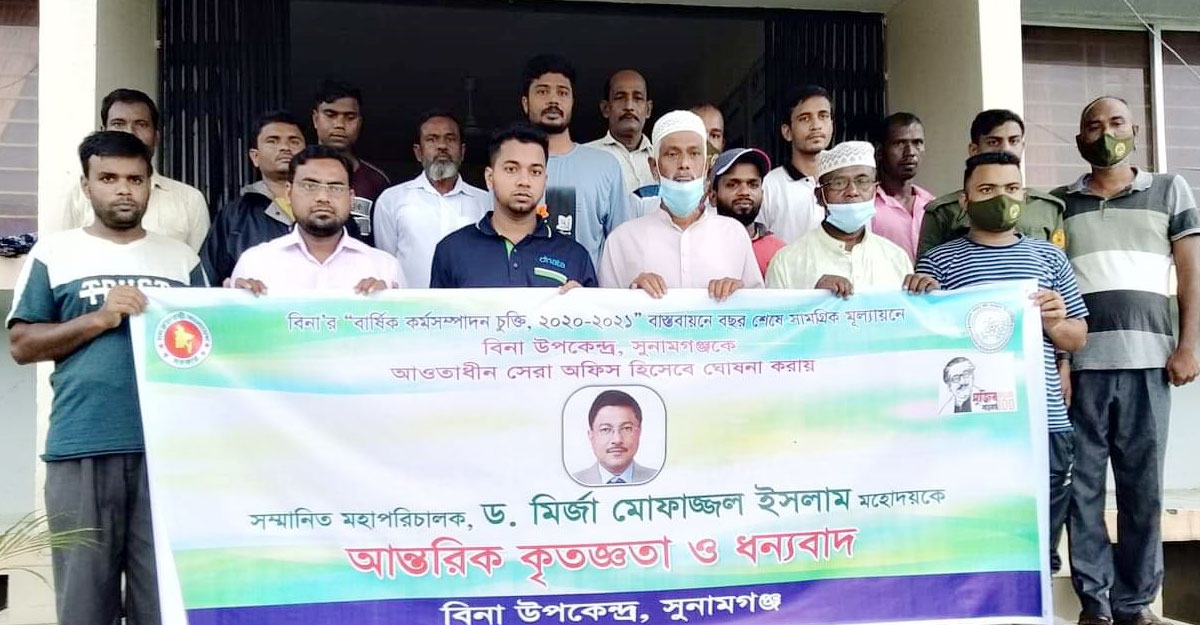 বুধবার (৩০ জুন) সকালে সুনামগঞ্জের বিনা উপকেন্দ্রের ভারপ্রাপ্ত বৈজ্ঞানিক কর্মকর্তা ও আব্দুর রাকিব জানান, রংপুর, মাগুরা, জামালপুর, ঈশ্বরদী, কুমিল্লা, সাতক্ষীরা, বরিশালসহ দেশের বিভিন্ন স্থানে ১৩টি উপকেন্দ্র রয়েছে। এরমধ্যে সুনামগঞ্জের বিনা উপকেন্দ্রের ‘বার্ষিক কর্ম সম্পাদন চুক্তি, ২০২০-২১’ বাস্তবায়নে বছর শেষে সামগ্রিক মূল্যায়নে বিনা উপকেন্দ্র সুনামগঞ্জকে সেরা অফিস হিসেবে ঘোষণা করা হয়।