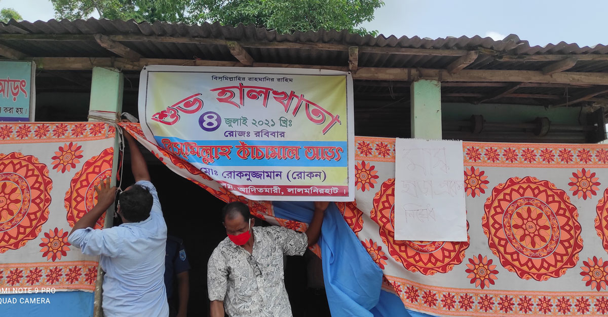 সরকারি বিধিনিষেধ উপেক্ষা করে লালমনিরহাট-বুড়িমারী মহাসড়কের পাশে ‘বিসমিল্লাহ কাঁচামাল আড়ৎ’ নামের এক দোকানে হালাখাতার আয়োজন করেছেন মালিক রোকনুজ্জামান রোকন। বিষয়টি জানতে পেরে জেলা প্রশাসনের নির্বাহী ম্যাজিস্ট্রেট মো. মাহবুবার রহমান তা বন্ধ করে দেন।
