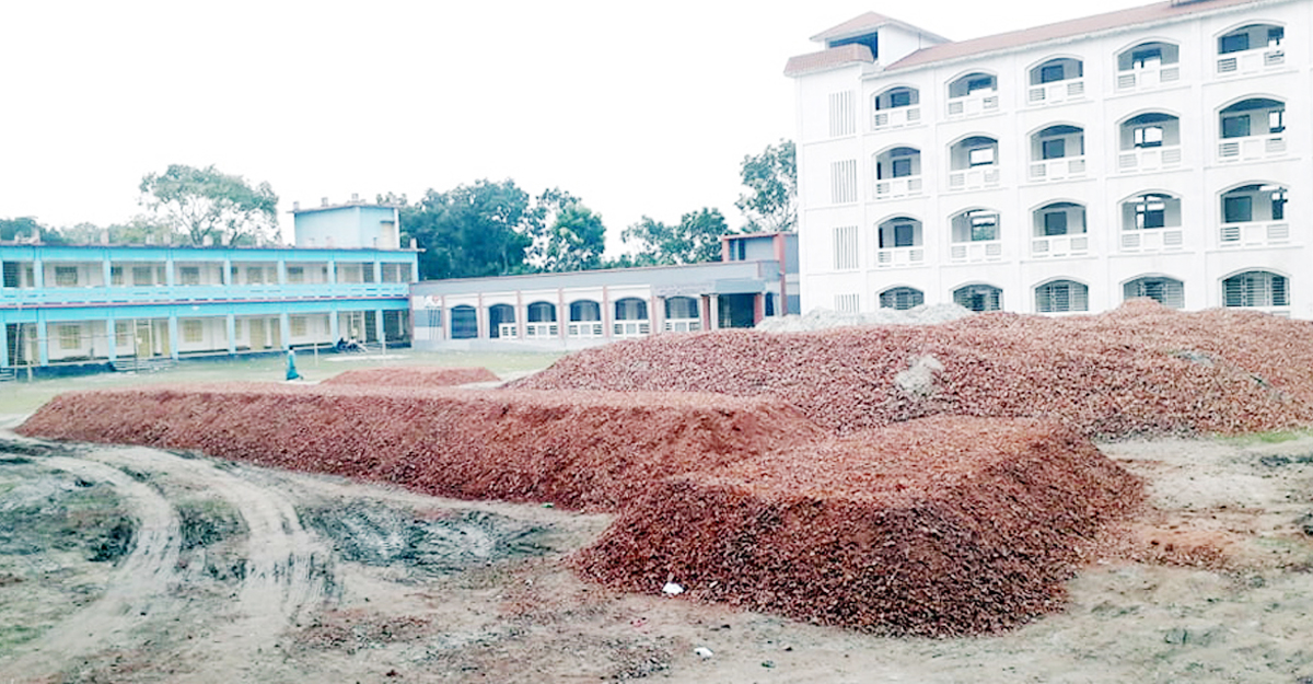 গোয়ালন্দে উজানচর ইউনিয়নের জামতলা উচ্চ বিদ্যালয়ের মাঠজুড়ে নির্মাণসামগ্রী