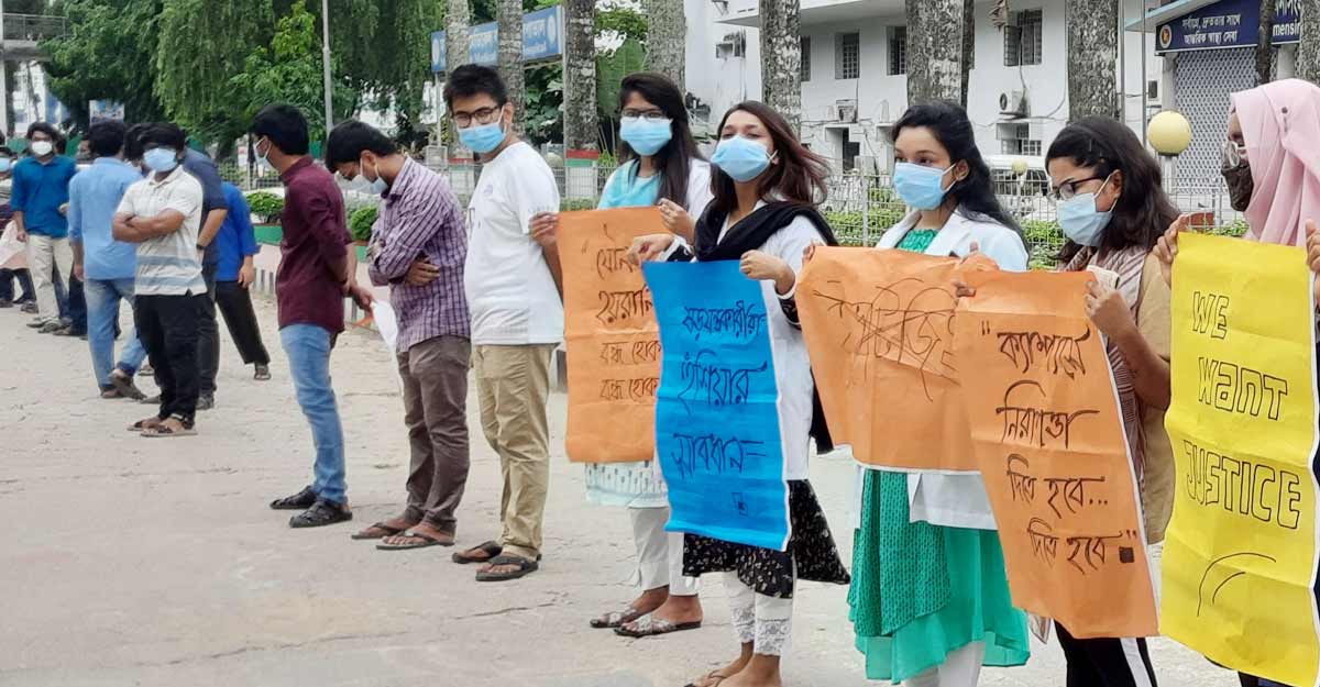 একই সঙ্গে নারী চিকিৎসকদের উত্ত্যক্তকারীদের শনাক্ত করে দ্রুত গ্রেফতারের দাবি জানানো হয় মানববন্ধন থেকে। এতে মমেকের সাধারণ শিক্ষার্থী, ইন্টার্ন চিকিৎসক ও শাখা ছাত্রলীগের নেতাকর্মীরা অংশ নেন।