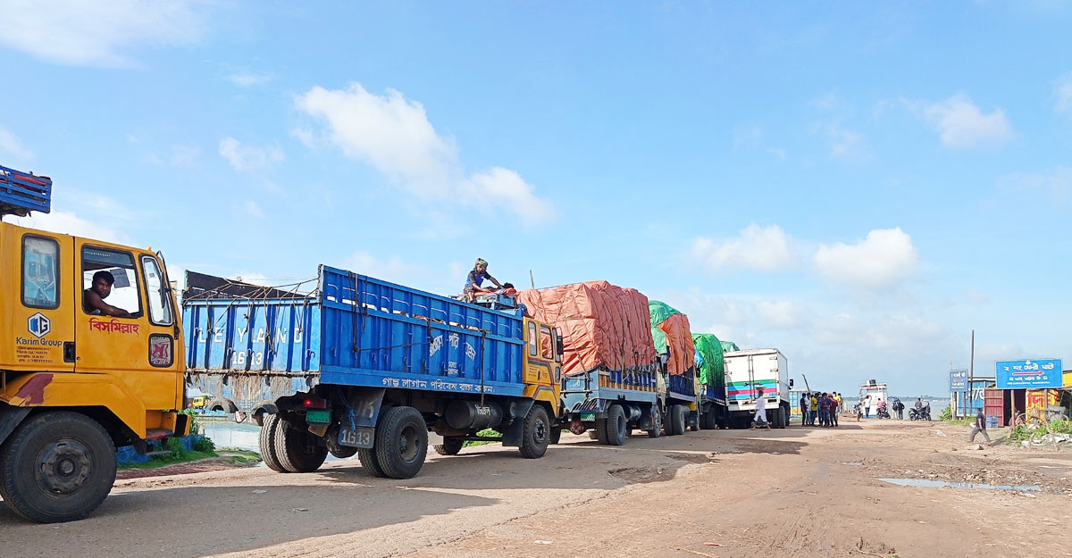 অন্যদিকে পাটুরিয়া ট্রাক টার্মিনাল দুটিতে আড়াইশ সাধারণ পণ্যবাহী ট্রাক নৌপথ পারাপারের অপেক্ষায় রয়েছে। সকাল ৮টা ৪০ মিনিটে দৌলতদিয়া ঘাট থেকে ছেড়ে আসা আমানত শাহ ফেরি কোরবানির পশু বোঝাই কয়েকটি ট্রাক, পণ্যবাহী ট্রাক এবং ঢাকামুখী কিছু যাত্রী নিয়ে পাটুরিয়া ৪ নং ফেরিঘাটে নোঙর করে।