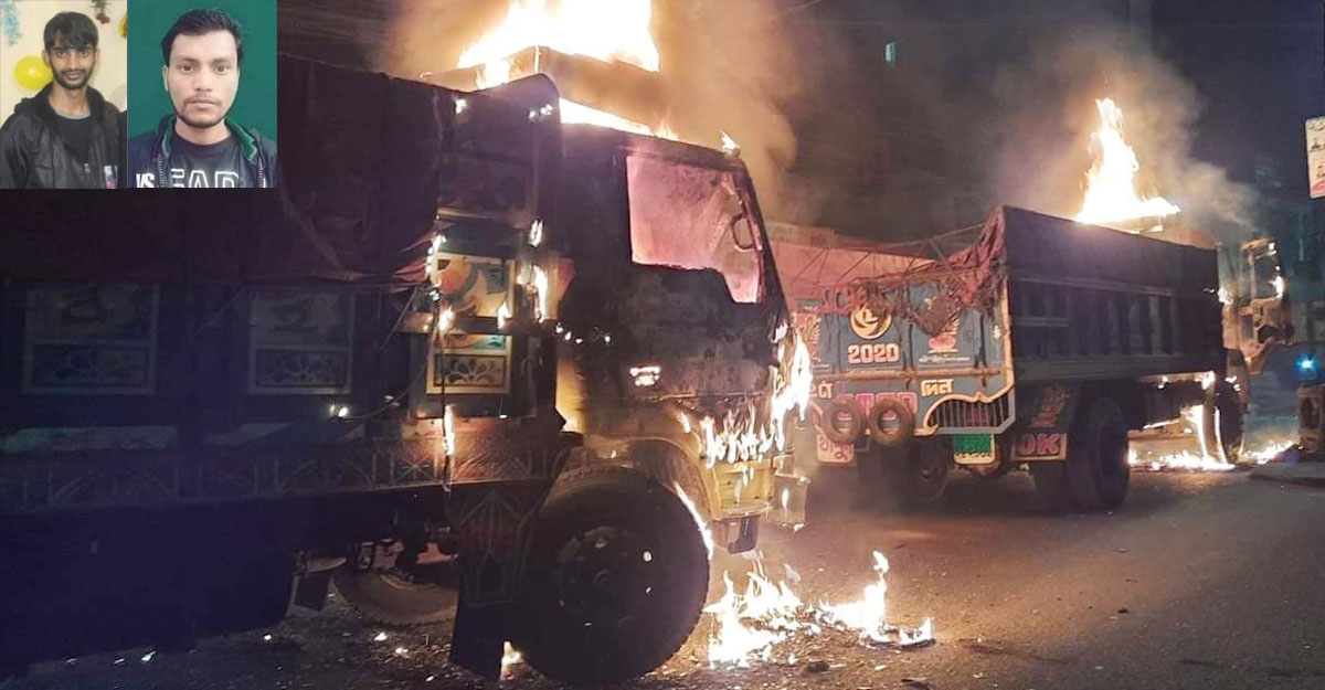 দুই ছাত্রদল কর্মীর মৃত্যু ঘটনায় ট্রাকে আগুন দিয়েছে বিক্ষুব্ধ জনতা (ইনসেটে লুৎফুর রহমান ও সজিব)