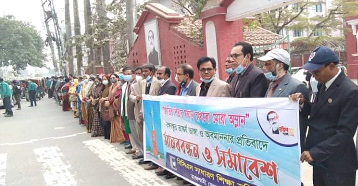বঙ্গবন্ধুর ভাস্কর্য ভাঙায় রাজশাহীতে শিক্ষকদের মানববন্ধন