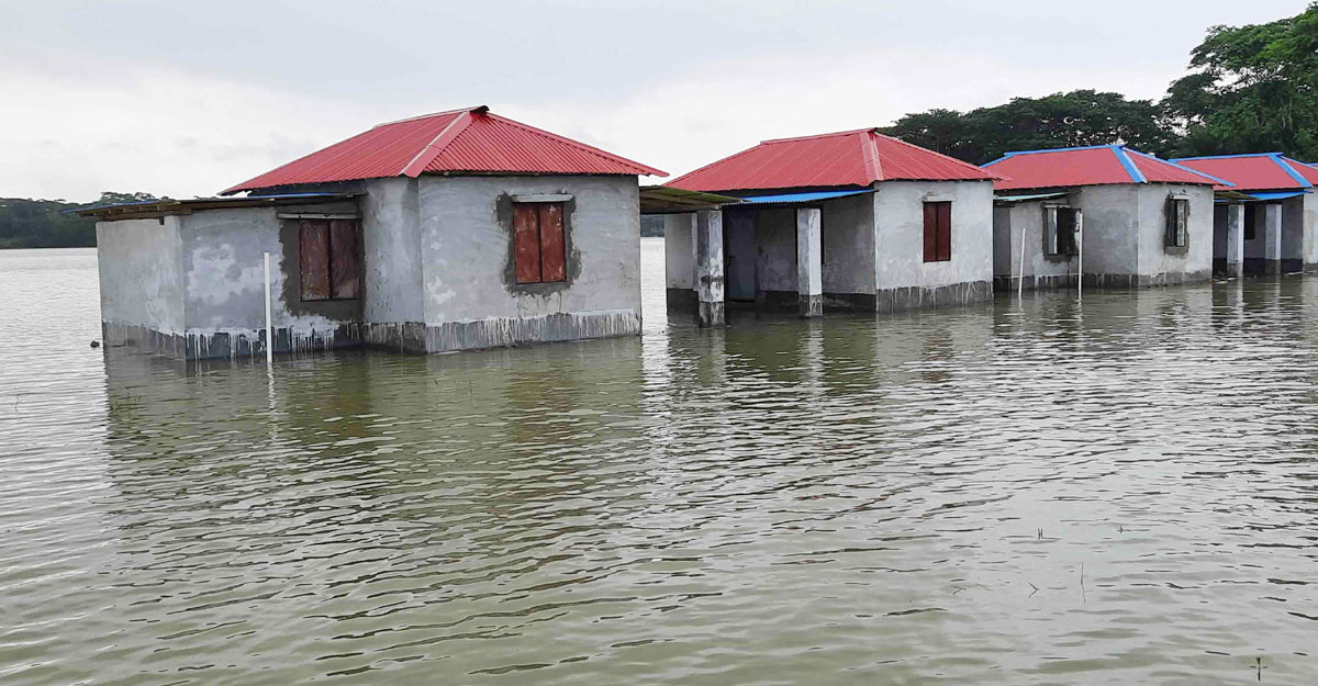 আশ্রয়ণ প্রকল্পের ঘরে পানি ওঠায় অন্যত্র আশ্রয় নিয়েছেন বাসিন্দারা