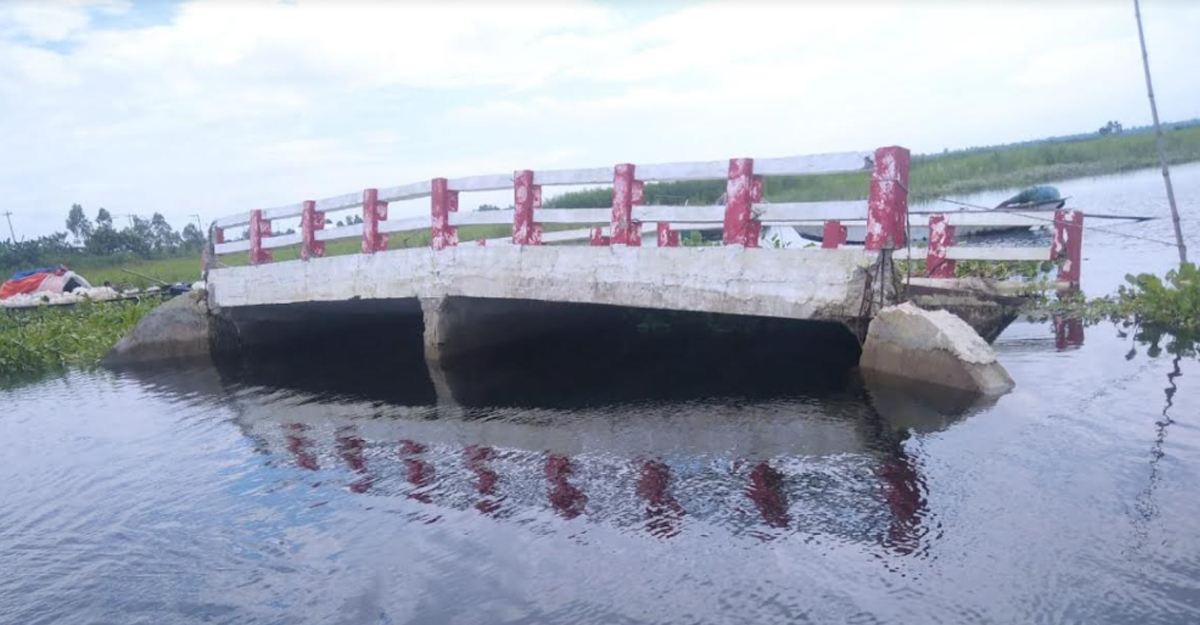অ্যাপ্রোচ সড়ক বিলীন হয়ে সেতুটি হেলে পড়েছে