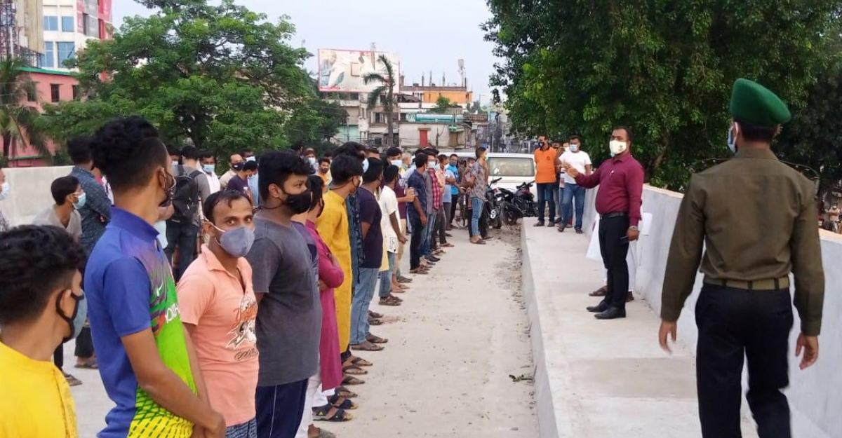 পরে দুই পাশ থেকে ঘিরে ফেলে ৬৫ জনকে আটক করা হয়। এরপর জেলা প্রশাসনের সহকারী কমিশনার ও নির্বাহী ম্যাজিস্ট্রেট জাকির হোসেন ভ্রাম্যমাণ আদালত পরিচালনা করে ৬৫ জনকে মোট ১৬ হাজার দুইশ টাকা জরিমানা করেন।