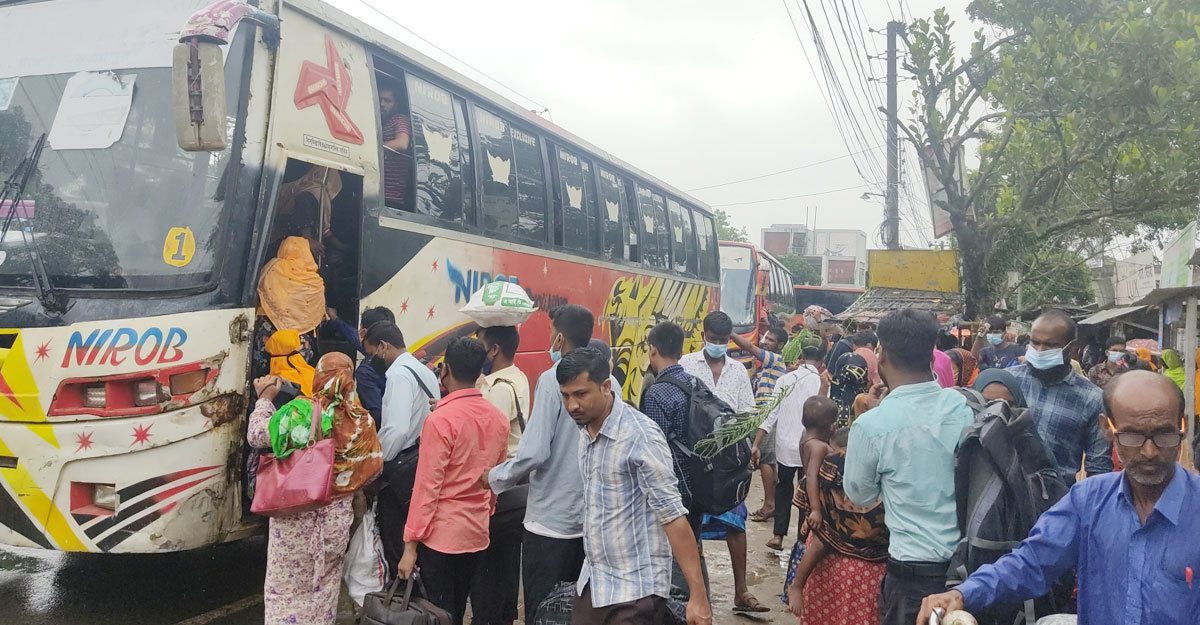 কঠোর লকডাউনের মধ্যে হঠাৎ পোশাক কারখানা খোলার ঘোষণায় মহাসড়ক ও আঞ্চলিক বাসস্ট্যান্ডগুলোতে কর্মজীবী নারী-পুরুষের উপচে পড়া ভিড় দেখা গেছে। যে যেভাবে পারছেন গন্তব্যে ফিরছেন।