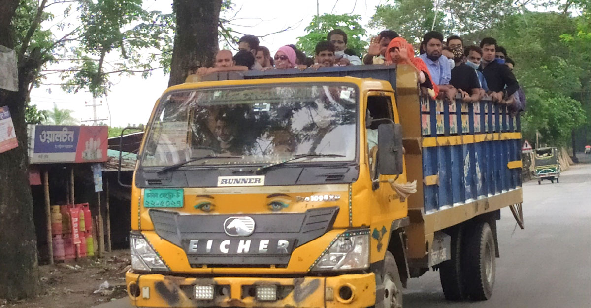 শনিবার (৩১ আগস্ট) বেলা ২টা থেকে বিকেল সাড়ে ৪টা পর্যন্ত সরেজমিনে দেখা গেছে, ঢাকা-বরিশাল মহাসড়কে একটু পরপরই দেখা মিলছে ট্রাকের। তবে এসব ট্রাকে নেই কোনো পণ্য। সব মানুষ। ট্রলিতে গাদাগাদি করে করে যারা যাচ্ছেন, তারা প্রায় সবাই তৈরি পোশাক কারখানার শ্রমিক। এতে মানা সম্ভব হচ্ছে না স্বাস্থ্যবিধি। দক্ষিণ-পশ্চিমাঞ্চলের এসব শ্রমিকের গন্তব্য গোয়ালন্দ ঘাট। তারপর সেখান থেকে ঢাকার উদ্দেশে পাড়ি।