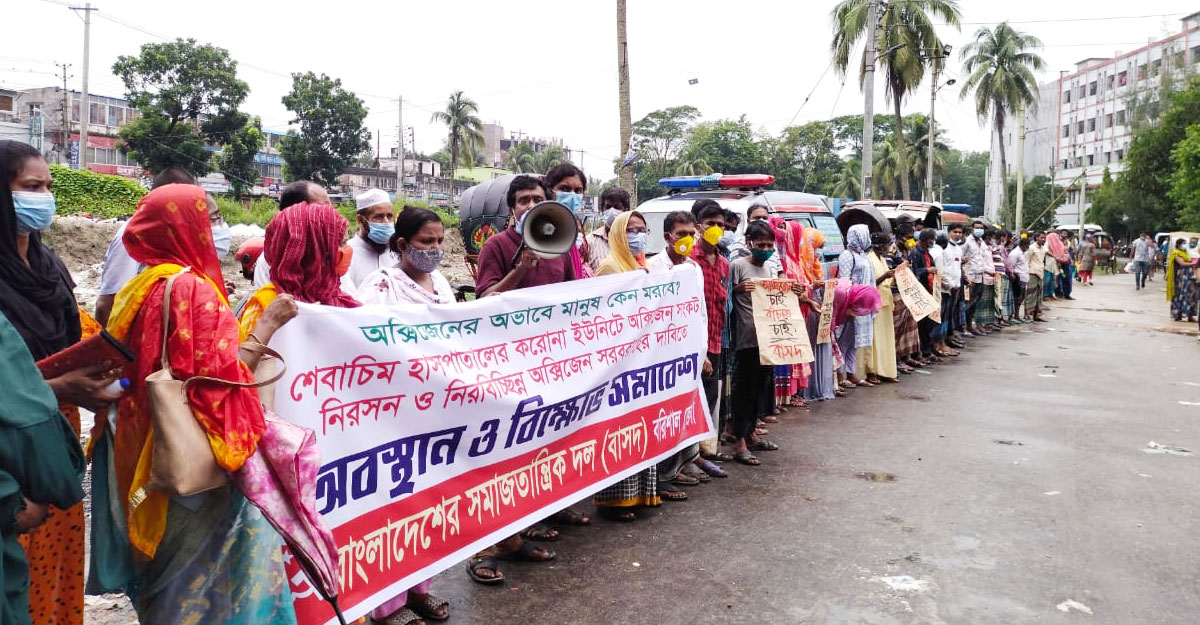 সমাবেশে বাসদের বরিশাল জেলা শাখার সদস্য সচিব ডা. মনীষা চক্রবর্তী বলেন, করোনা ইউনিটে দিন দিন রোগীর মৃত্যুর সংখ্যা বৃদ্ধি পাচ্ছে। এর কারণ অক্সিজেন সংকট। এখানে একটি অক্সিজেন সিলিন্ডার পেতে হলে কমপক্ষে ৬/৭ ঘণ্টা একজন রোগীকে অপেক্ষা করতে হচ্ছে।