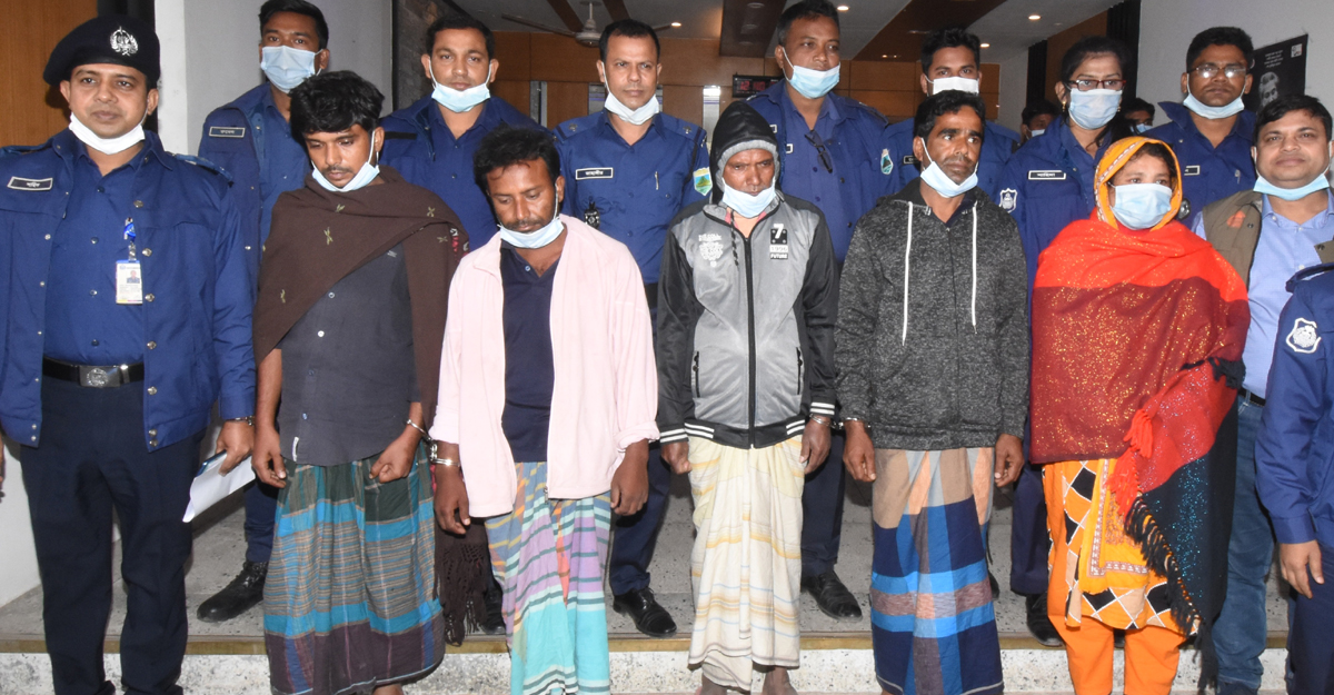 গ্রেপ্তারকৃতরা হলেন শেরপুরের হলদিবাড়ি আটাপাড়া গ্রামের মৃত মান্নান মন্ডলের ছেলে মো. ওমর ফারুক (৩৫), একই উপজেলার ইটালি মধ্যপাড়া গ্রামের দুলাল হোসেনের ছেলে মাে. ফারুক আহমেদ (৩০), মৃত রসুলের ছেলে আব্দুর রাজ্জাক (৫৮), মৃত কেরামত আলীর ছেলে জিয়াউর রহমান জিয়া (৪০) ও তার স্ত্রী শাপলা খাতুন (৩৫)।