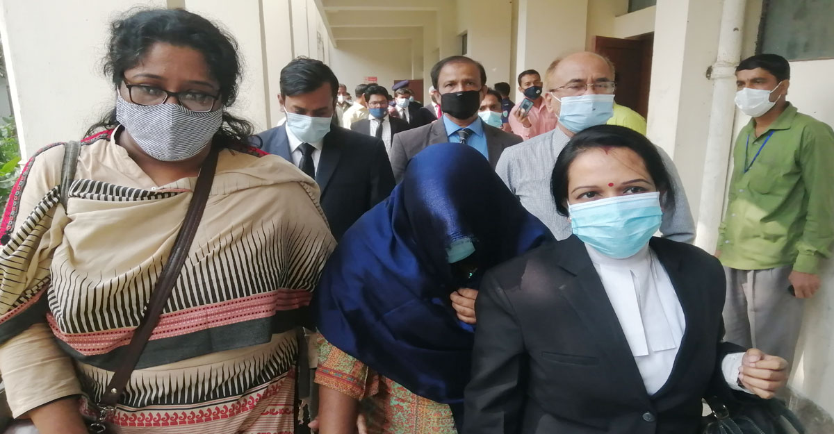 জামিন পেয়ে আদালতের বারান্দায় এনজিও কর্মী ফারজানা আক্তার