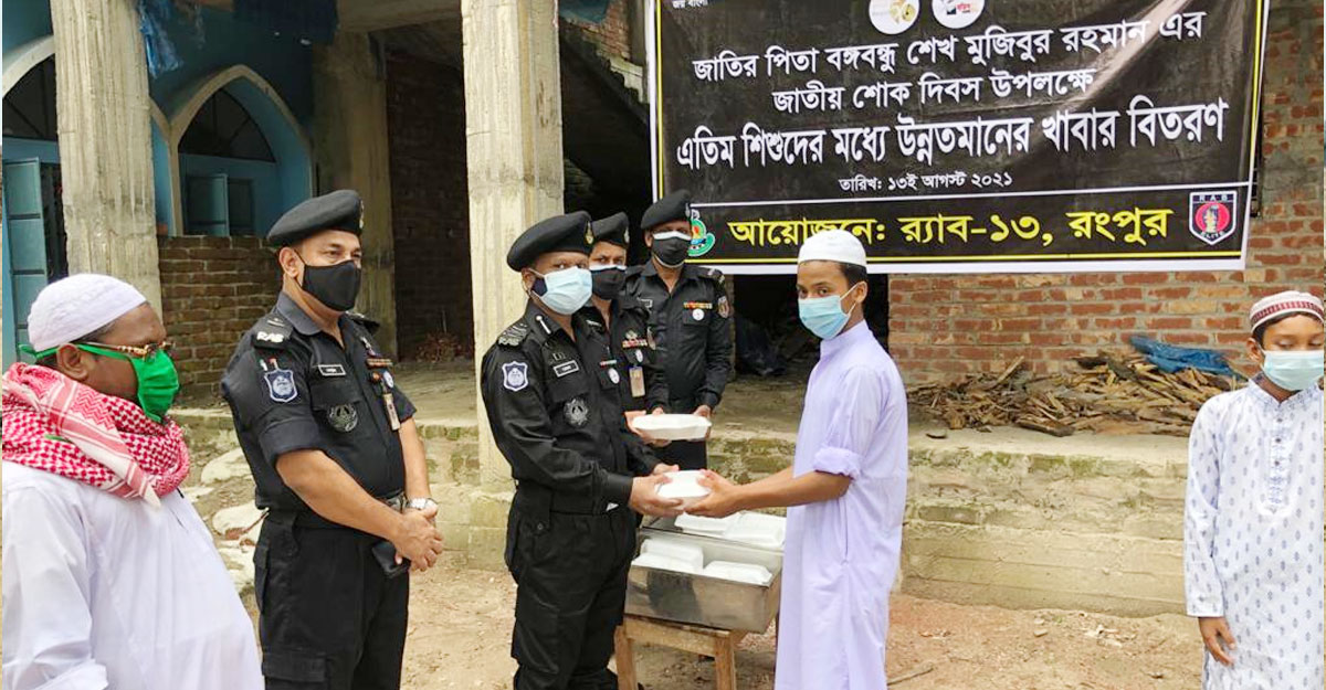 র্যাব-১৩ এর সহকারী পরিচালক (মিডিয়া) এএসপি মুহাম্মদ আল-আমিন সরকার বিষয়টি নিশ্চিত করে জানান, জাতীয় শোক দিবস উপলক্ষে বিভিন্ন কর্মসূচি নেওয়া হয়েছে। এর মধ্যে শুক্রবার কোরান খতম, এতিম ও দুস্থদের মাঝে উন্নত খাবার বিতরণ করা হয়।