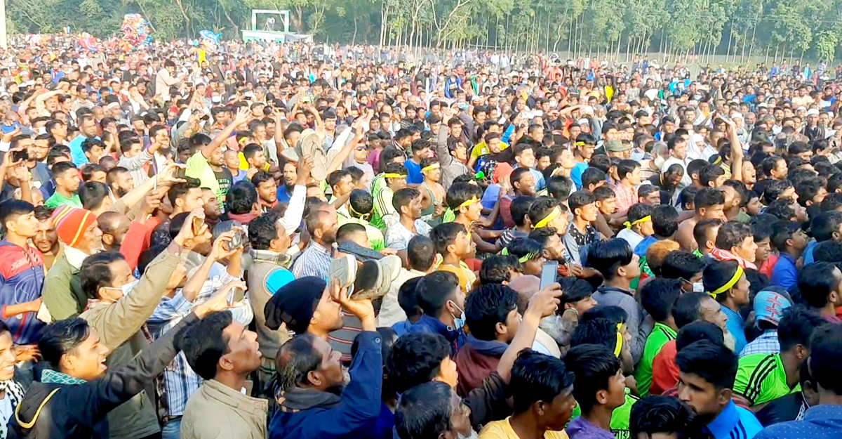 বৃহস্পতিবার (১৪ জানুয়ারি) পৌষের বিকেলে পশ্চিম আকাশে তখন হেলে পড়েছে সূর্য। উপজেলার লক্ষ্মীপুর ও দশমাইল এলাকার মাঝামাঝি তালুক-পরগনা সীমান্তকে ঘিরে অপেক্ষমাণ লাখও জনতা।