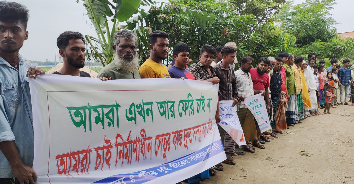 মানববন্ধনে বক্তারা বলেন, ফেরি চালু করলে নদীর তীরে ৩০ ফুট গভীর করতে হবে। ফলে তীরের আশপাশের ঘরবাড়ি নদীগর্ভে বিলীন হয়ে যাবে। বালু বিক্রি করে ফায়দা লুটবে প্রভাবশালীরা। এতে করে ক্ষতিগ্রস্ত হবে ফসলি জমি। তাই আমরা এখন আর ফেরি চাই না। নির্মাণাধীন সেতুটির নির্মাণ কাজ দ্রুত সম্পন্ন করা হোক।