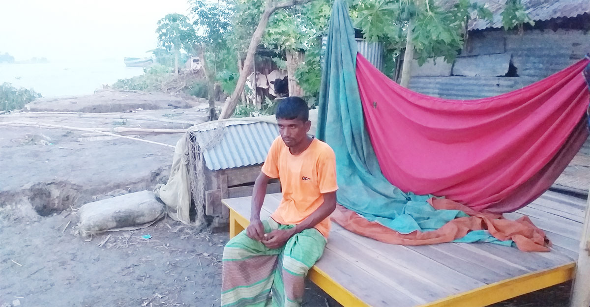 পাশেই বইছে পদ্মা নদী। নদীভাঙনে নিজের ঘরবাড়ি অন্যত্র সরিয়ে নিলেও তার পুরোনো বসতভিটার মায়া তিনি ত্যাগ করতে পারছেন না। তাই উন্মুক্ত আকাশের নিচেই একটি চৌকি পেতে প্রতিদিন বসবাস করছেন মজিবুর (৪০)।