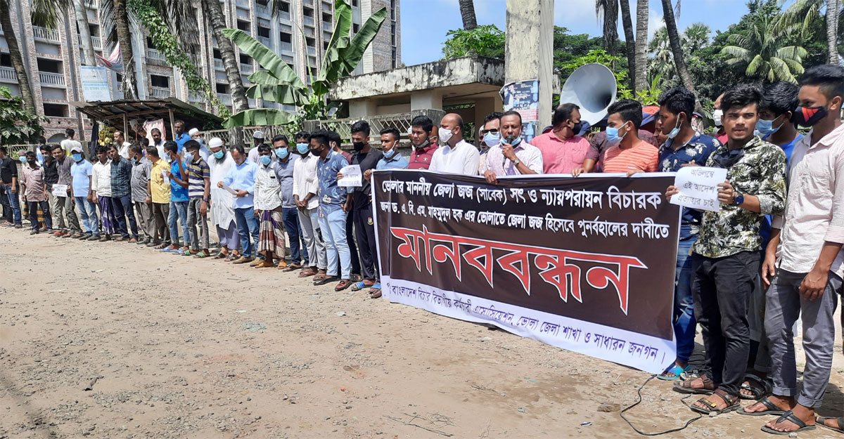 ভোলায় বিচারকের বদলির আদেশ বাতিলের দাবিতে মানববন্ধন