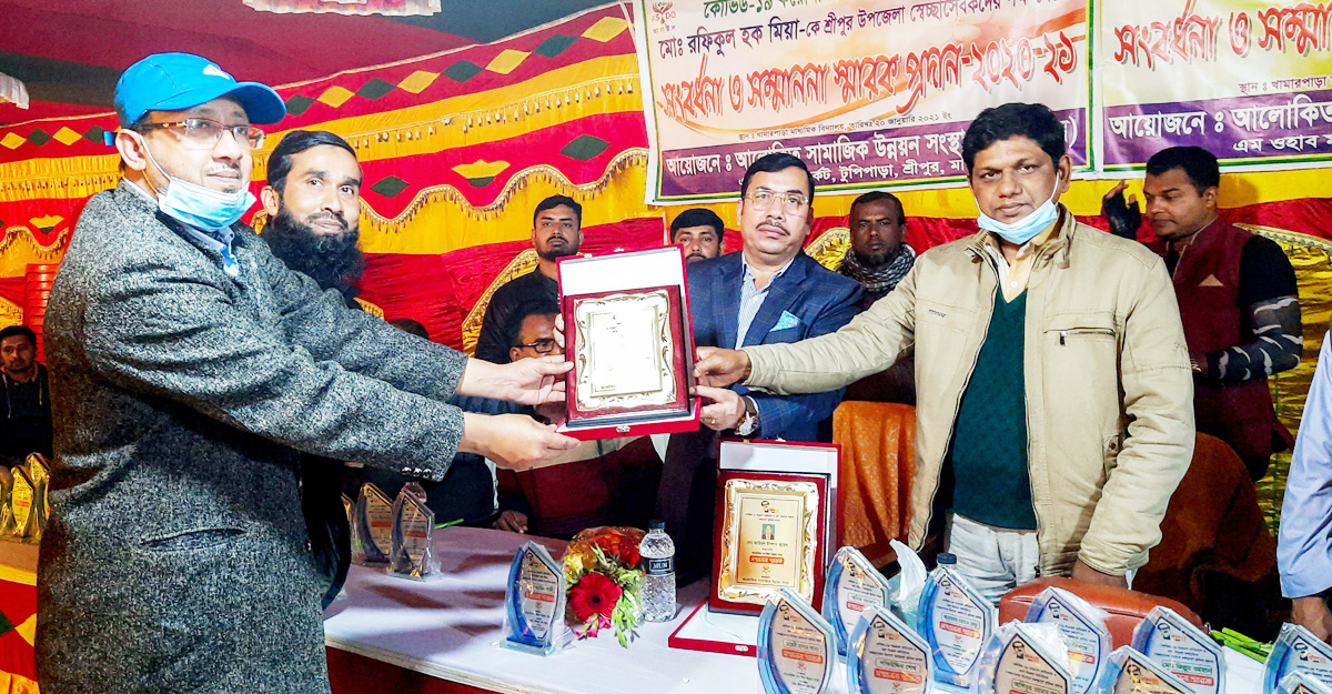 মাগুরার শ্রীপুর উপজেলায় করোনা মোকাবিলায় অবদান রাখায় ৭১ জন স্বেচ্ছাসেবককে বিশেষ সম্মাননা দিয়েছে আলোকিত সামাজিক উন্নয়ন সংস্থা।