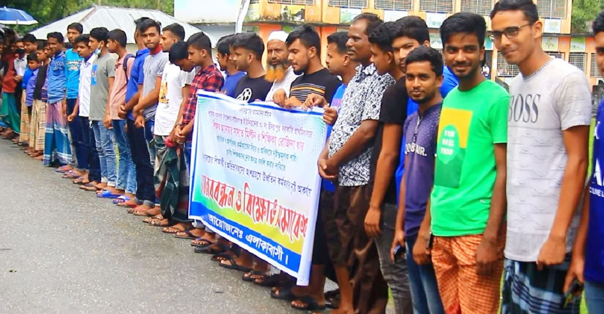 অভিযুক্ত শিক্ষকদের শাস্তি চেয়ে বুধবার (২২ সেপ্টেম্বর) দুপুরে মানববন্ধন করে এলাকাবাসী