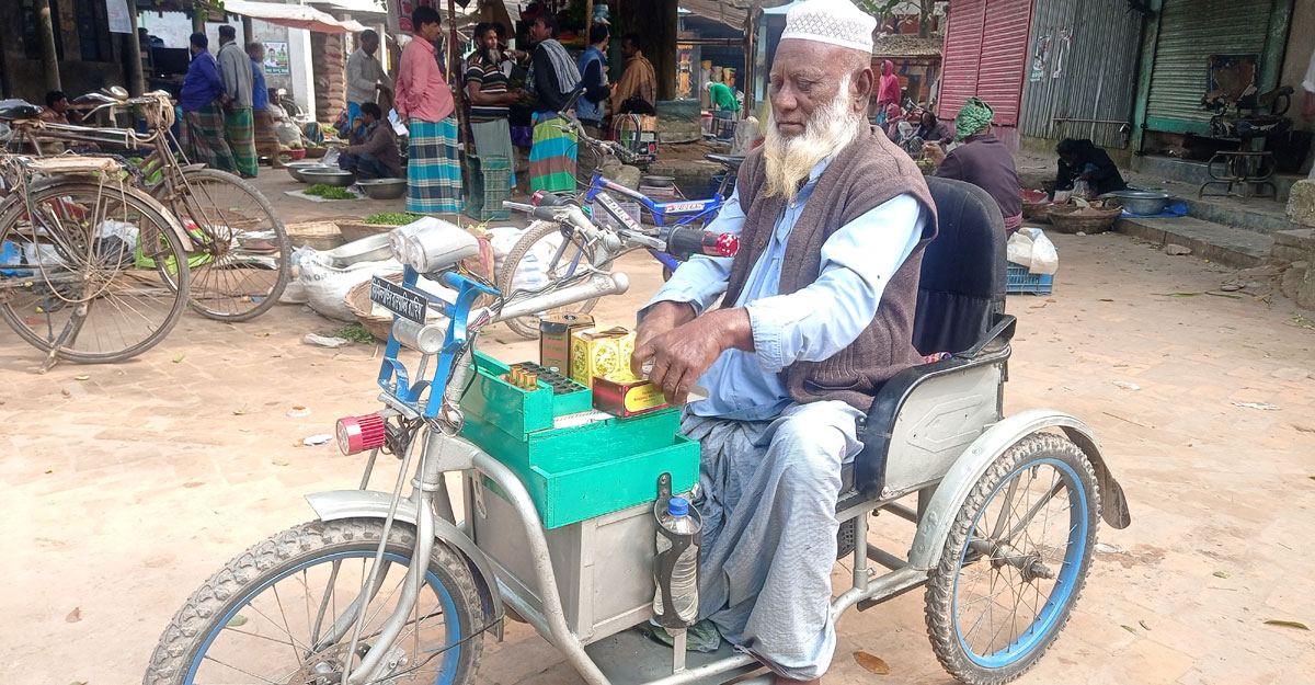 ব্যাটারিচালিত তিন চাকার ছোট একটি রিকশায় করে আতর বেচেন রজ্জব আলী