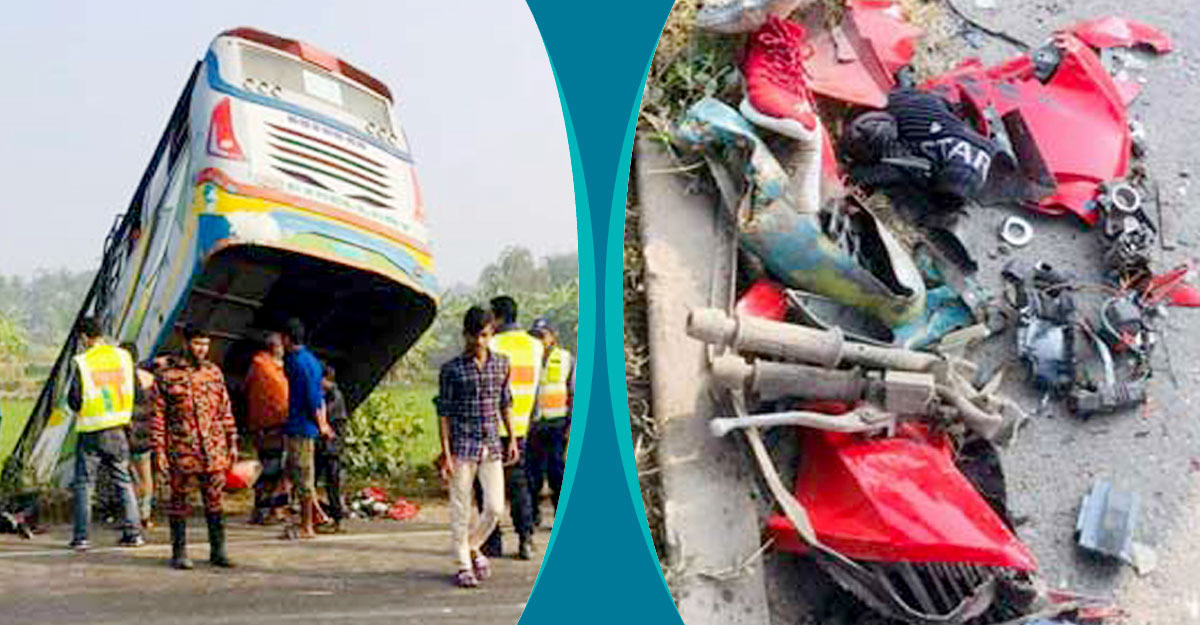 মোটরসাইকেলে ধাক্কা দিয়ে উল্টে গেল বাস, নিহত ১