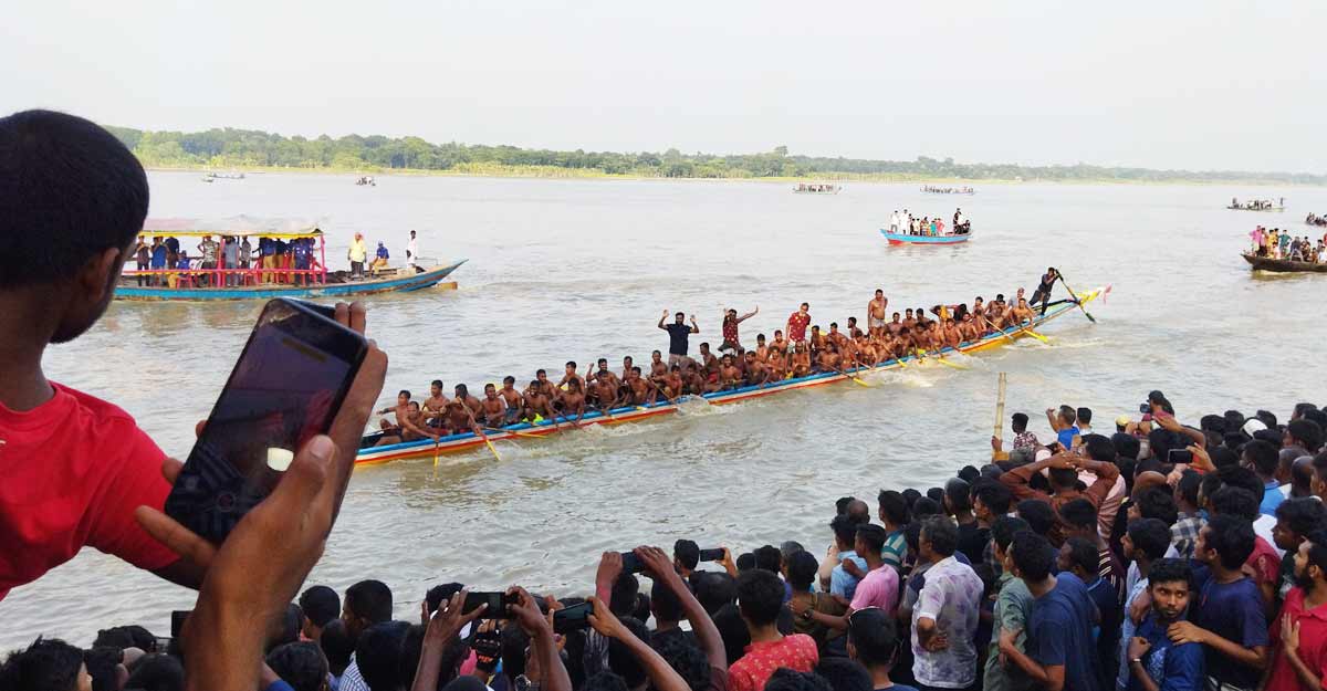 কাঁসার ঘণ্টার তালে তালে আর বৈঠার ছলাৎ ছলাৎ শব্দে দুর্বার গতিতে এগিয়ে চলছিল একে একে নৌকাগুলো। চড়ন্দারের ঘণ্টার তালে তালে মাঝি-মাল্লার বৈঠার ছন্দে ছন্দে যৌবনভরা গড়াই নদের বুকে ছুটে চলছিল রকেট, জলপরি, লালন শাহসহ বাহারি নামের আটটি নৌকা।