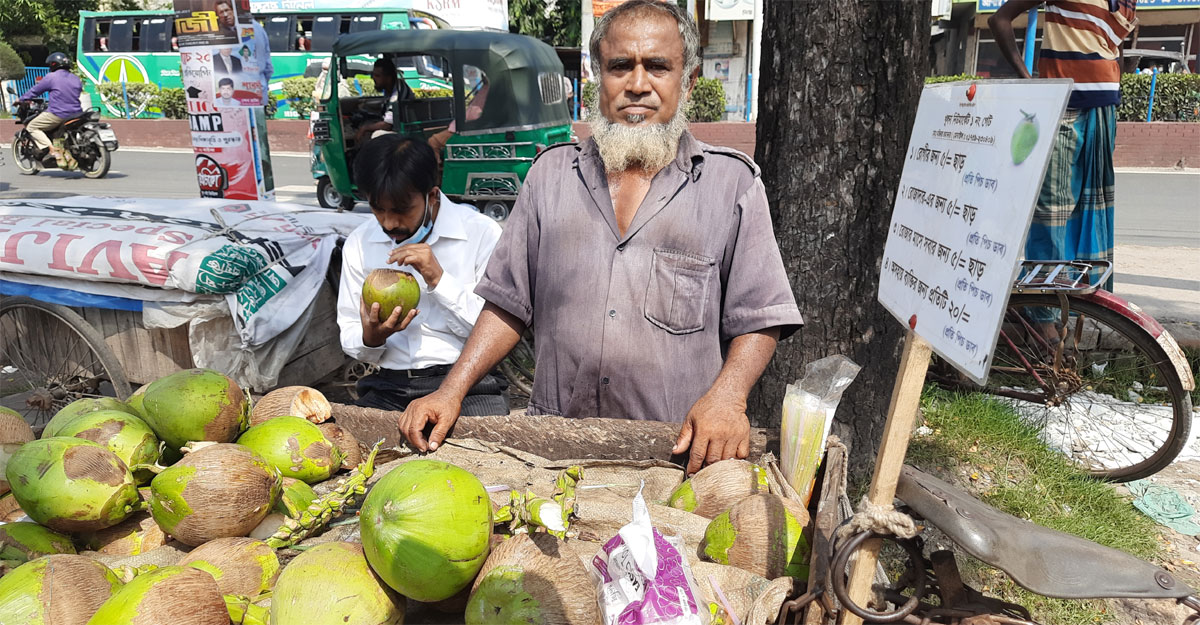 সকাল থেকে ভ্যান চালিয়ে ঘেমেনেয়ে ডাব খেতে এসেছেন আব্দুল জলিল। তিনি ঢাকা পোস্টকে বলেন, আমি ভ্যান চালাই। রোদে ভ্যান চালাতে হয়। ডাব খাইলে শরীরটা একটু ভালো লাগে। ভ্যান চালিয়ে ৫০-৬০ টাকা দিয়ে ডাব কিনে খাওয়া তো সম্ভব হয় না। এ জন্য এই (মুজিবর) কাকার কাছে আসি। তিনি ২০ টাকায় ডাব দেন।