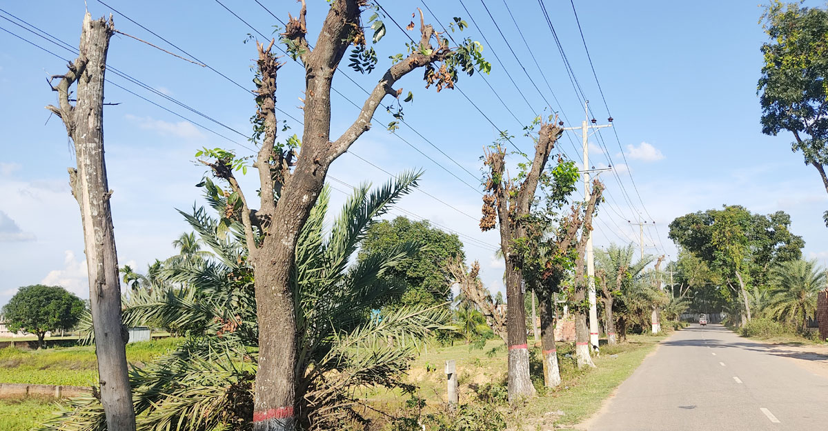পল্লী বিদ্যুতের নতুন উপকেন্দ্র থেকে আরেক উপকেন্দ্রে সঞ্চালন তার টাঙানোর জন্য কেটে ফেলা হয়েছে বিভিন্ন প্রজাতির হাজারো গাছের মাথা। গাছগুলো ন্যাড়া হয়ে সড়কের দু’পাশে দাঁড়িয়ে আছে। গণহারে গাছের ডালপালা ও মাথা কাটার ফলে পরিবেশের ভারসাম্য হারানোর পাশাপাশি জীব-বৈচিত্র্য ধ্বংস হওয়ার আশঙ্কা করছেন পরিবেশ বিশেষজ্ঞরা।