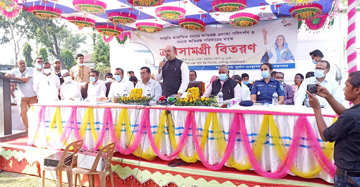 ত্রাণ বিতরণকালে প্রতিমন্ত্রী বলেন, রংপুর, লালমনিরহাট, নীলফামারী ও কুড়িগ্রামে ৫০ মেট্রিক টন চাল, পাঁচ লাখ টাকা ও শুকনো খাবার এবং গো-খাদ্যের জন্য দুই লাখ টাকা বরাদ্দ দেওয়া হয়েছে। এছাড়াও প্রত্যেক জেলায় ২শ বান্ডিল টিন দেওয়া হবে এবং ৬ লাখ টাকা দেওয়া হবে।