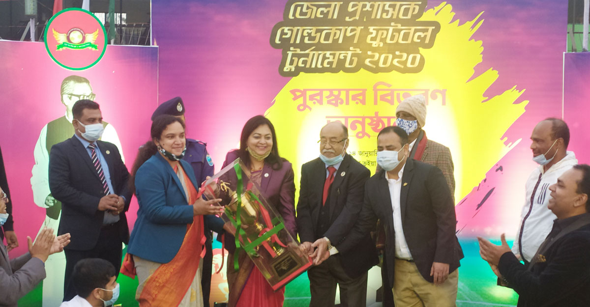 এ সময় উপস্থিত ছিলেন জেলা প্রশাসক সৈয়দা ফারহানা কাউনাইন। ট্রফি ছাড়াও চ্যাম্পিয়ন ও রানার্সআপ দলকে যথাক্রমে এক লাখ ও ৫০ হাজার টাকা অর্থ পুরস্কার দেওয়া হয়।