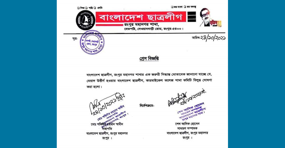 কারমাইকেল কলেজ ছাত্রলীগ কমিটি বিলুপ্ত ঘোষণা