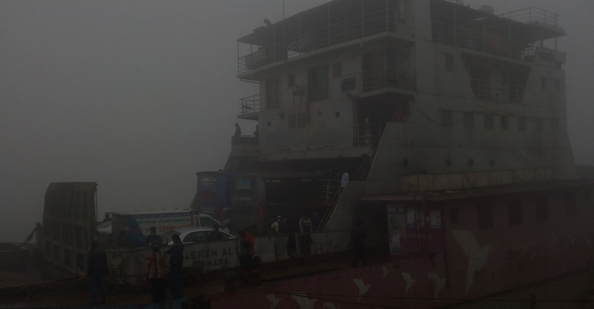 ঘন কুয়াশার কারণে দুর্ঘটনা এড়াতে নৌরুটে ফেরি চলাচল বন্ধ রাখা হয়েছে (ছবিটি পাটুরিয়া ফেরিঘাট থেকে তোলা)