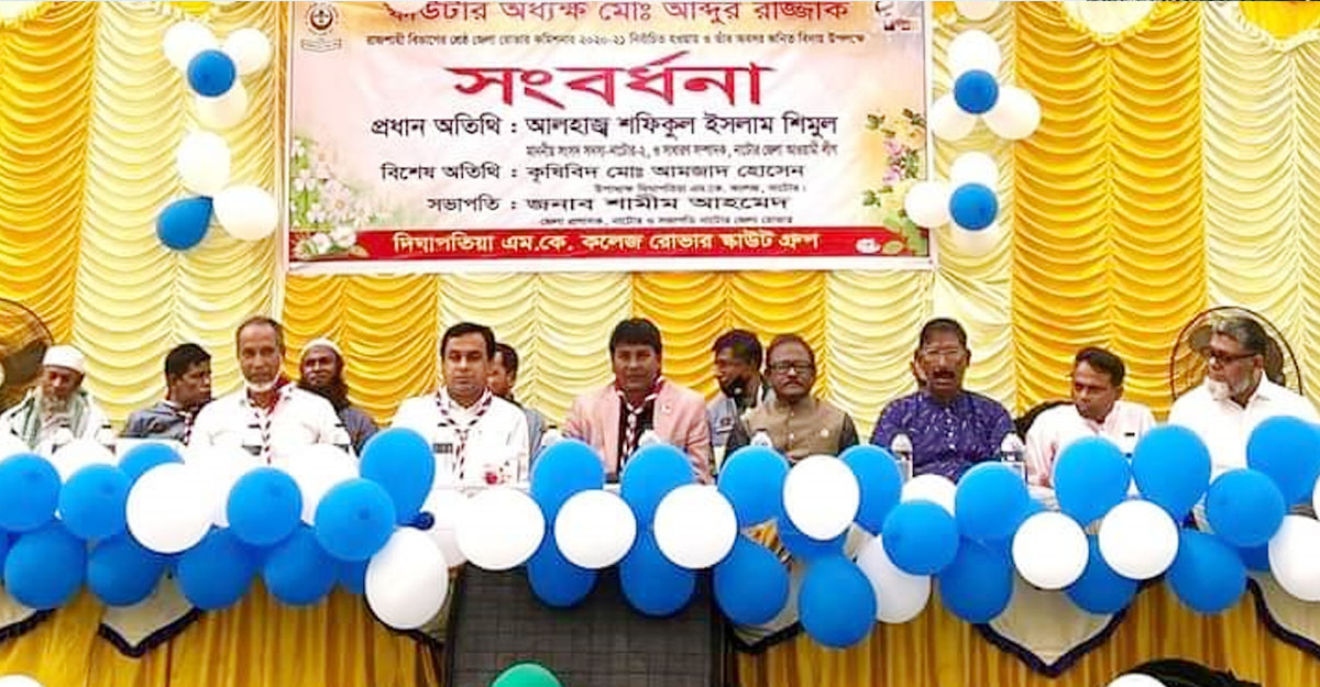 নাটোরের দিঘাপতিয়া এম.কে. কলেজের অধ্যক্ষ আব্দুর রাজ্জাক রাজশাহী বিভাগের শ্রেষ্ঠ রোভার স্কাউট কমিশনার নির্বাচিত হওয়ায় সংবর্ধনা দিয়েছে কলেজের রোভার স্কাউট গ্রুপ।