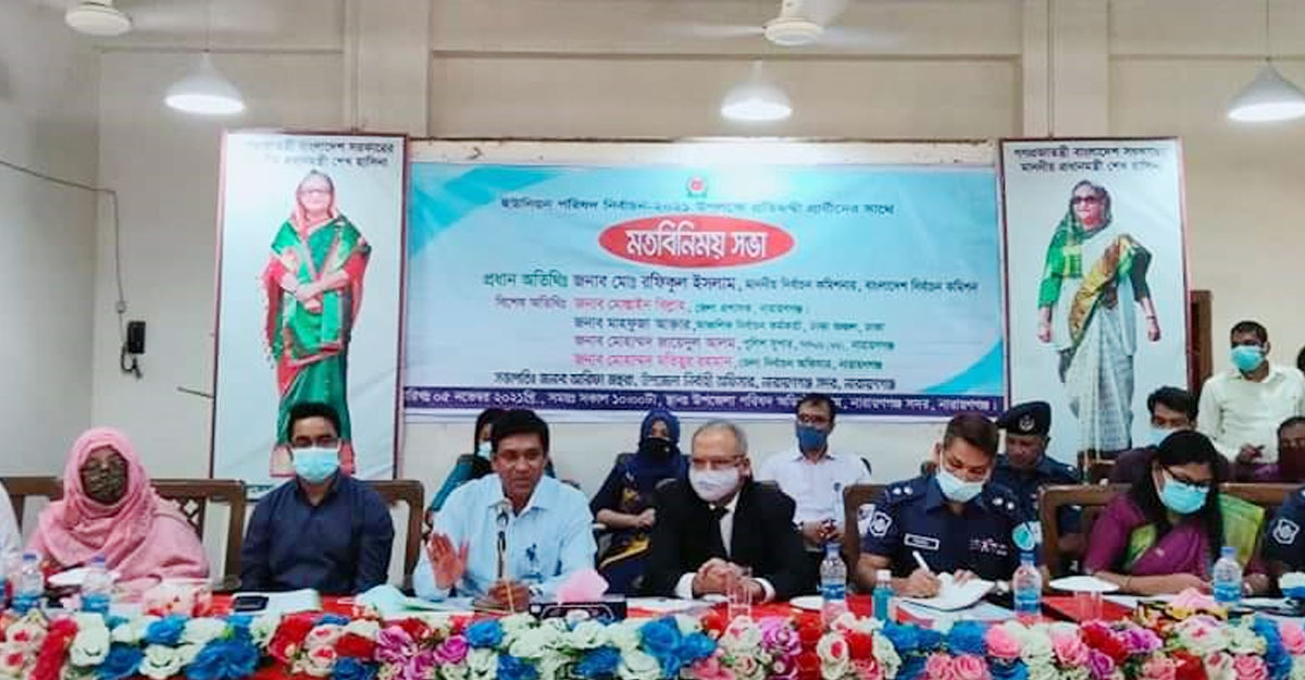 নারায়ণগঞ্জ সদর উপজেলা নির্বাহী কর্মকর্তা (এইএনও) আরিফা জহুরার সভাপতিত্বে অনুষ্ঠিত মতবিনিময় সভায় বিশেষ অতিথির বক্তব্য রাখেন- নারায়ণগঞ্জের জেলা প্রশাসক (ডিসি) মোস্তাইন বিল্লাহ, ঢাকা অঞ্চলের আঞ্চলিক নির্বাচন কর্মকর্তা মাহফুজা আক্তার, জেলা পুলিশ সুপার (এসপি) মো. জায়েদুল আলম ও জেলা নির্বাচন অফিসার মো. মতিয়ুর রহমান।